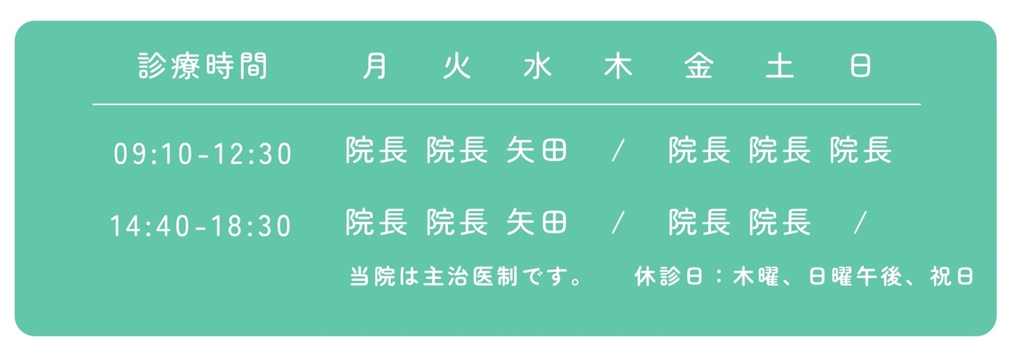| 月火金土日曜の診察は大熊院長です。水曜の診察は矢田医師です。当院は主治医制です。 | ||||||
