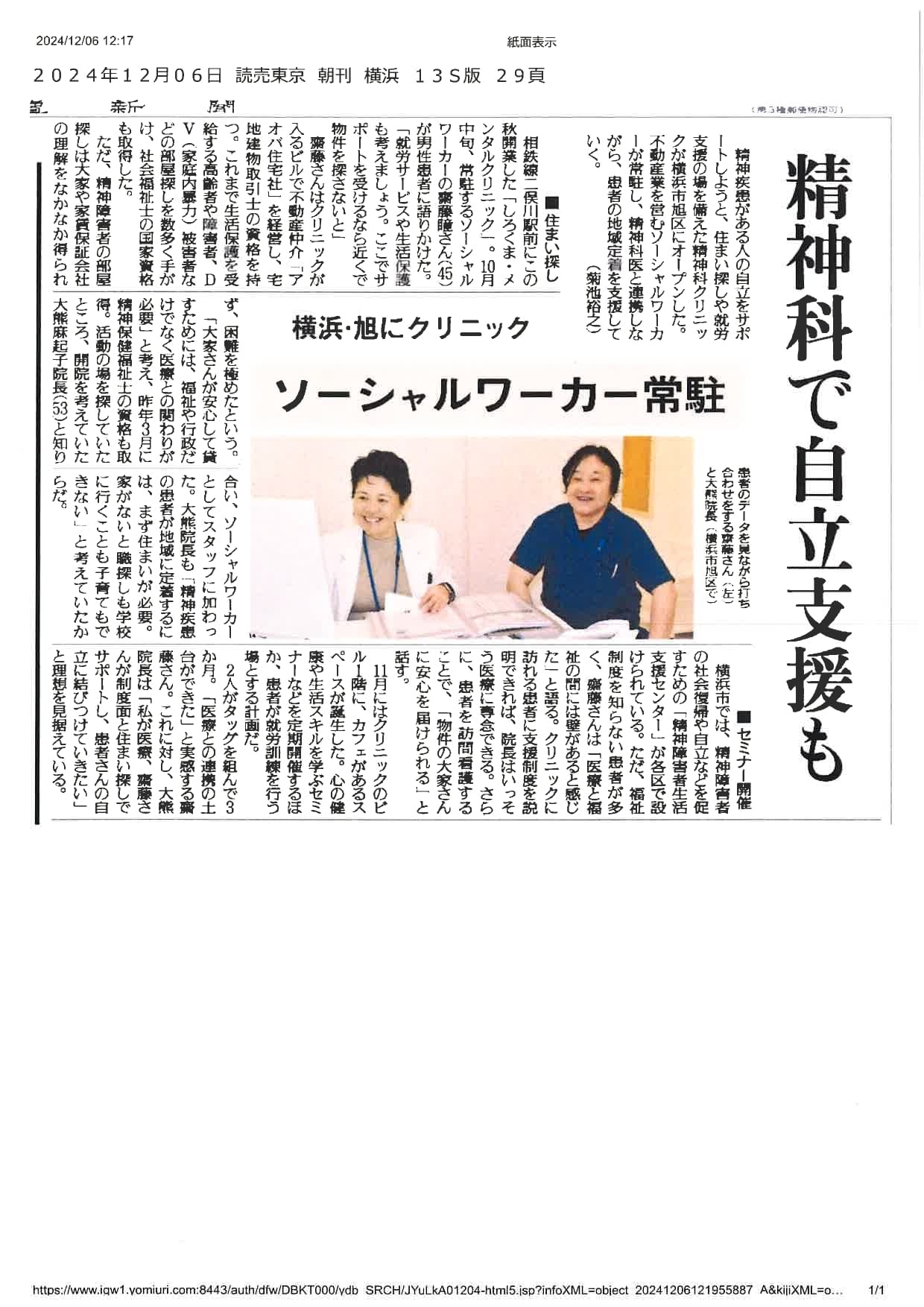 2024年12月06日読売新聞朝刊に当院が掲載されました。
